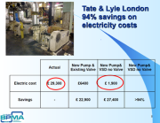 The Tate & Lyle case shows a 94% saving in electricity costs (£29,300 annually) by replacing the original single speed pump and reduction valve for a variable speed pump.