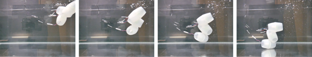 When swimming on their own, RoboSalps modules are difficult to control, but after joining them together to form colonies, they become more stable and show sophisticated movements.